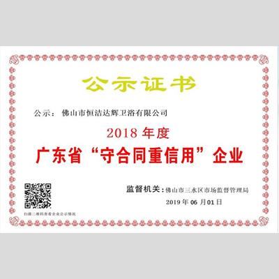 獎 項(xiàng):"2018年度廣東省“重合同守信用”企業(yè) ——佛山市恒潔衛(wèi)浴有限公司"